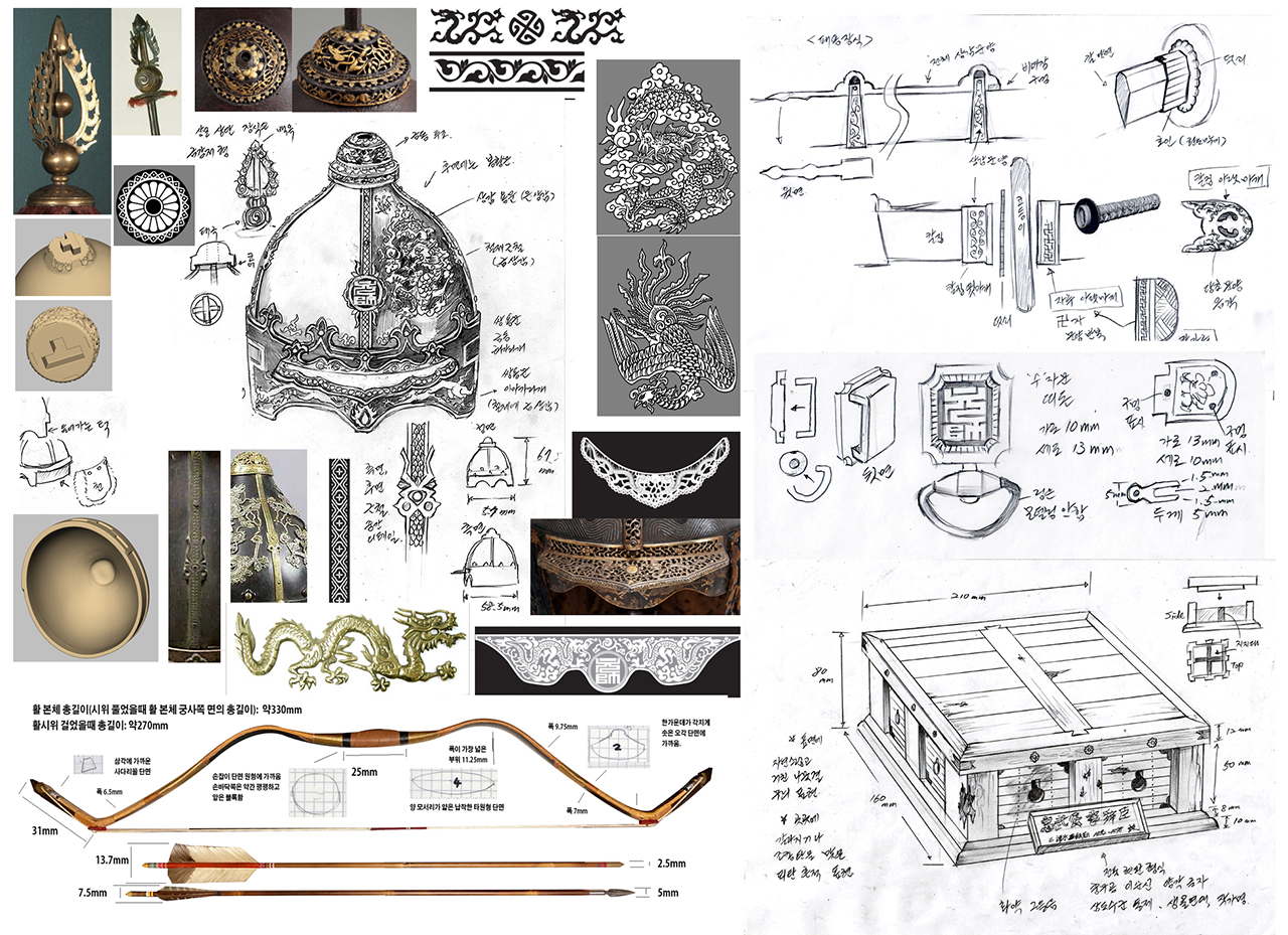 일례로 투구의 경우 저는 국내외에 산재한 총 46점의 투구 유물들을 조사하고 참고해 '왜란 당시 최고위급 무장이 사용했음직한 16세기 투구'를 새롭게 디자인 해야 했습니다.