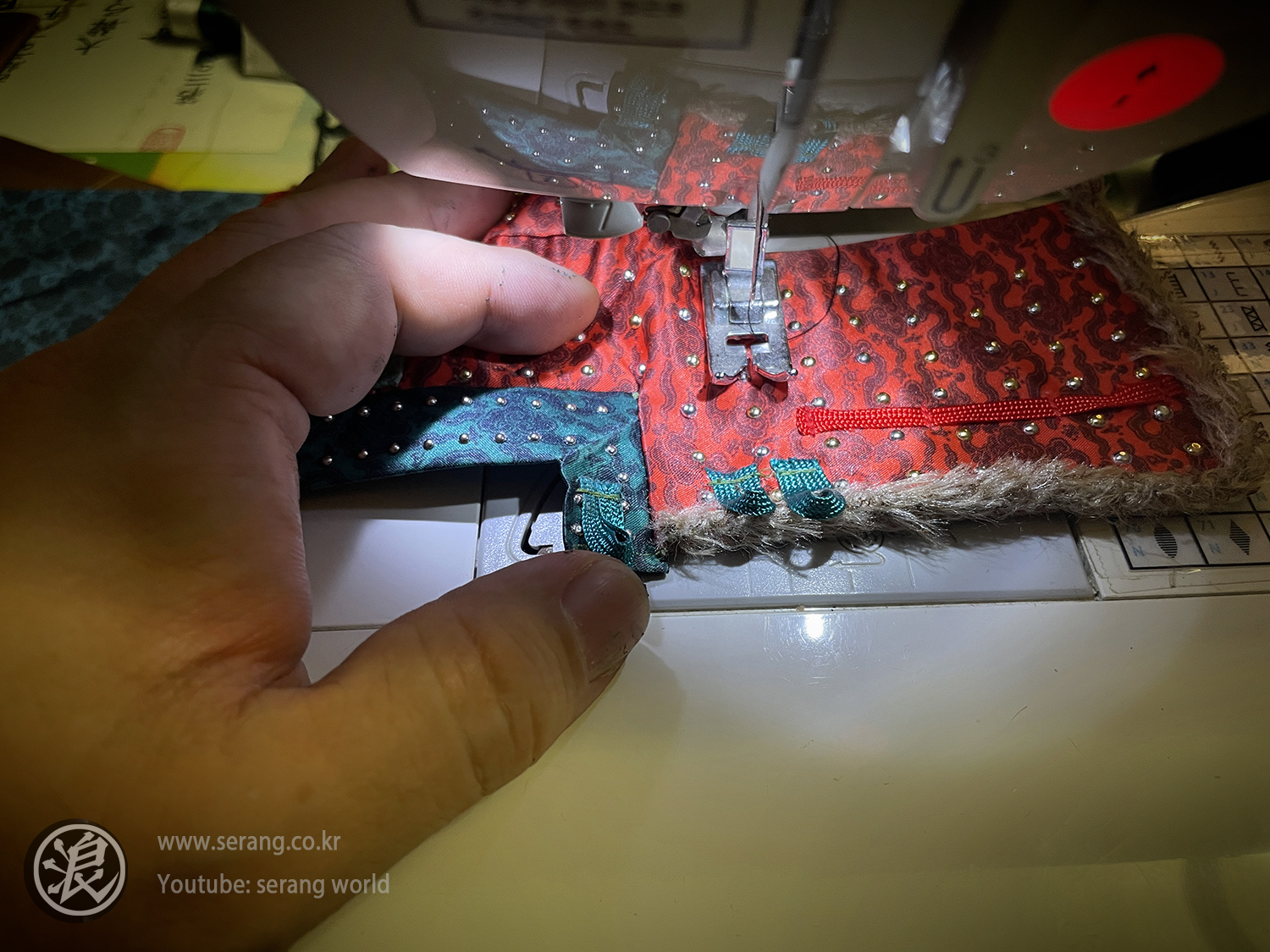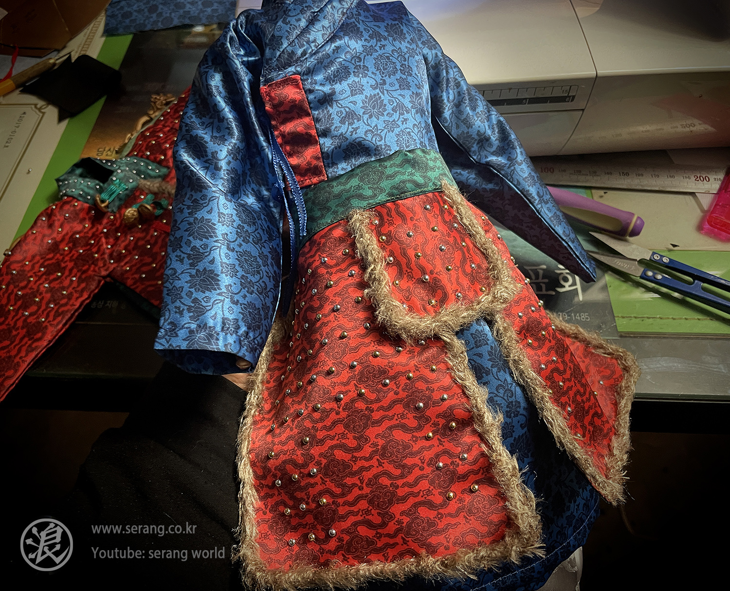 갑옷은 역시 직접 디자인하고 제작한 16세기 운보문단을 원단으로 사용해 제작하는데, 흔히 보는 두정갑이 아니라 조선 초기에 제도가 마련된 최고위급 갑옷인 두두미갑을 국내최초로 재현해본 것입니다.