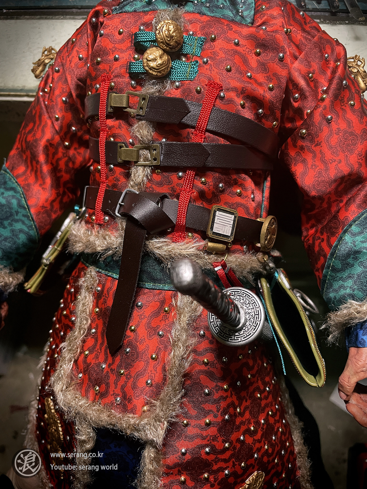 갑옷은 역시 직접 디자인하고 제작한 16세기 운보문단을 원단으로 사용해 제작하는데, 흔히 보는 두정갑이 아니라 조선 초기에 제도가 마련된 최고위급 갑옷인 두두미갑을 국내최초로 재현해본 것입니다.